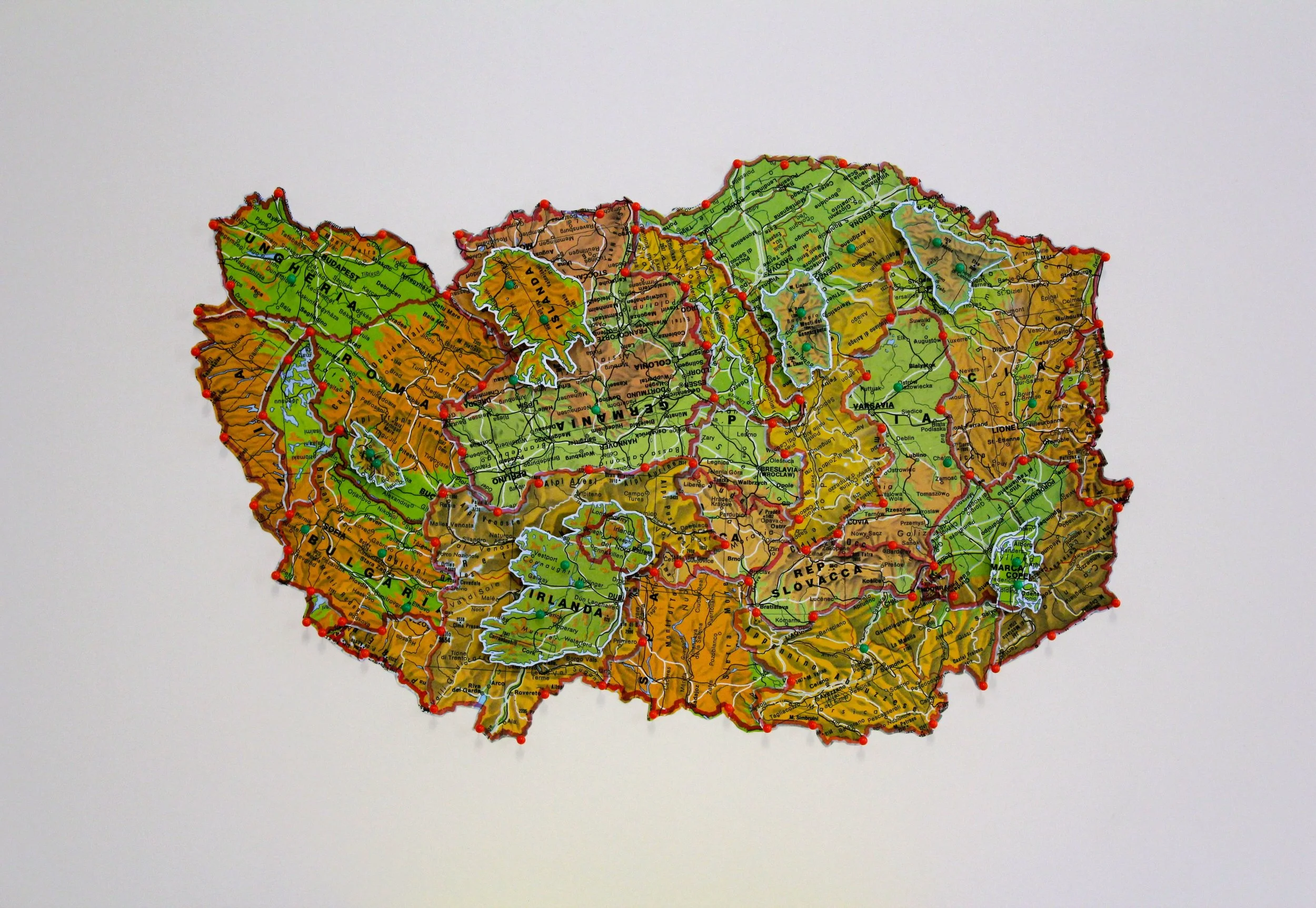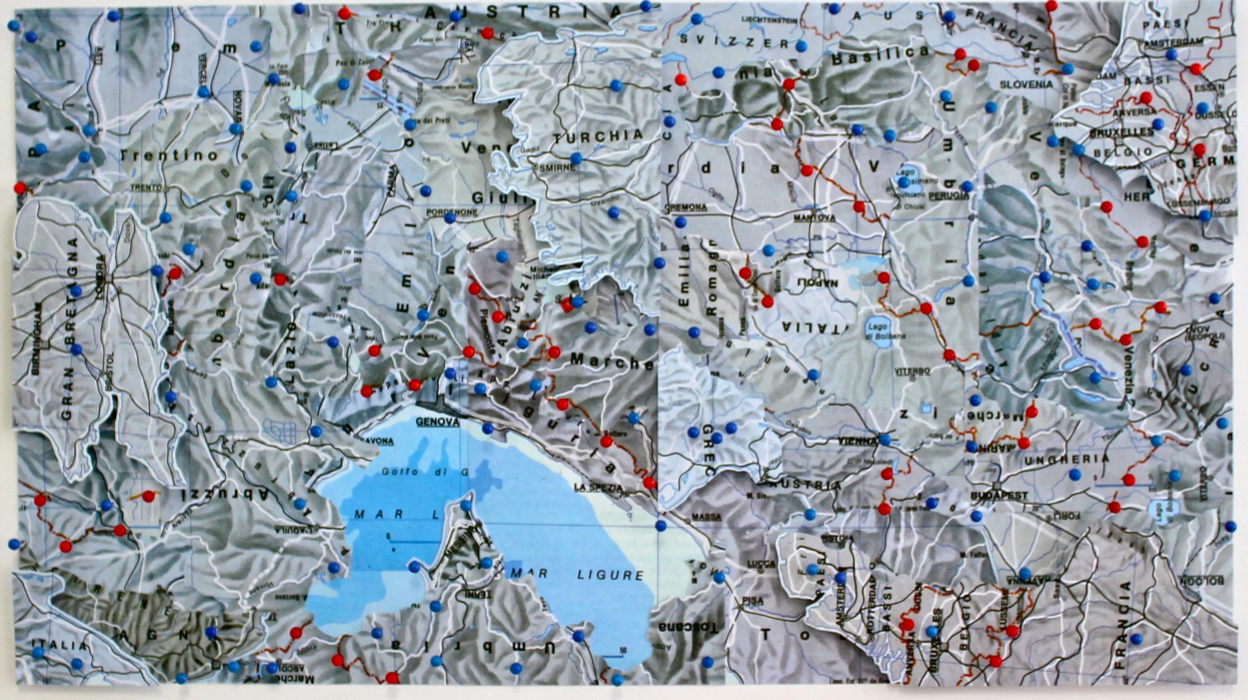 Map collage: handcut maps, map pins, foamboard, Glasochrom pencil